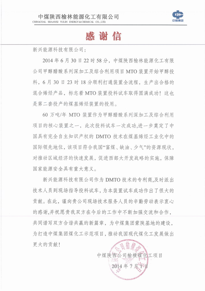 中煤陕西榆林能源化工有限公司发来感谢信-新兴能源科技有限公司