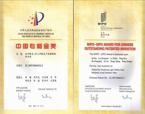 甲醇或/和二甲醚生产低碳烯烃的方法专利获第十三届中国专利金奖(图)