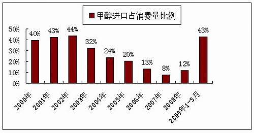 亚化咨询统计,进口甲醇曾经在我国甲醇消费量中占了相当的比例,但是随着国内甲醇工业的发展,从2002年到2007年,进口甲醇所占比例从45%左右下降到了不到10%,2008年略有回升,为12%。但是2009年1-5月我国进口甲醇量猛增,月平均接近60万吨,占甲醇消费量比例达到了43%;出口下降到了300吨每月左右。