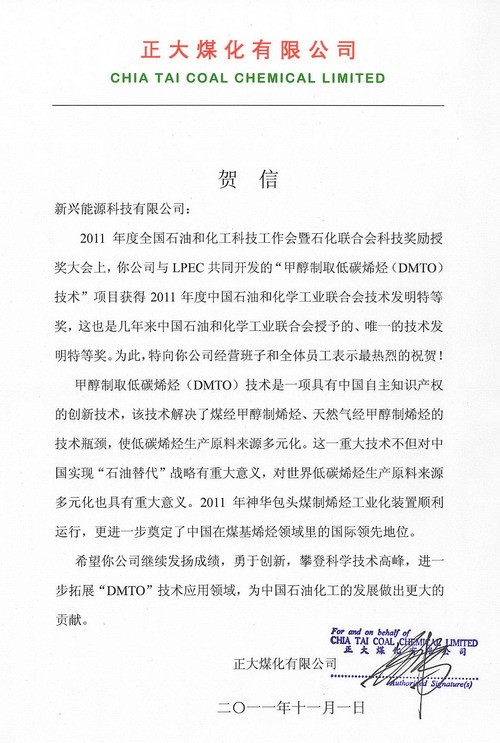 正大煤化有限公司祝贺新兴公司DMTO获“技术发明特等奖”(图)-新兴能源科技有限公司