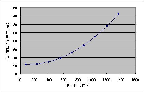 与石油路线的烯烃生产法相比,DMTO技术具有很强的经济优势。以60万吨/年DMTO项目为例,对其经济性进行了分析并与石脑油制烯烃路线进行了初步对比分析。图1为相同的烯烃生产成本时(石脑油路线为扣除副产后的可变成本),煤炭价格与原油离岸价格的对应关系。当煤价为400元/吨时,对应的原油离岸价格约为30美元/桶。煤价从200元/吨降低至70元/吨时,对应的原油价格(23-25美元/桶)几乎不再变化,说明较低的煤炭价格并不能更有效地增加煤制烯烃的经济竞争力,主要由于煤炭原料成本在烯烃生产成本中的比重大幅度降低的原因。更高的原油价格,如145美元/桶,可以允许高达1360元/吨的煤价,烯烃生产成本仍然能够持平。很明显,DMTO技术的煤制烯烃生产路线具有显著的经济竞争力。